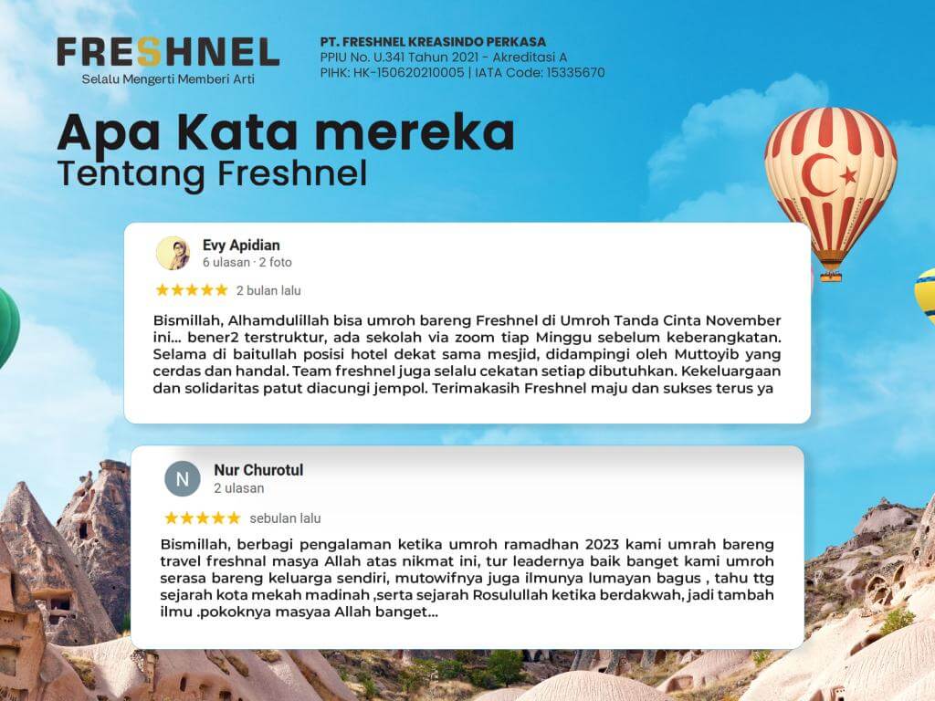 - Mendapatkan pengembalian dana setelah dikurangi biaya pendaftaran dan biaya lain yang sudah dikeluarkan oleh PT. Freshnel Kreasindo Perkasa, atau melimpahkan keberangkatan kepada ahli waris lainnya jika calon jamaah meninggal dunia atau mengalami cacat/sakit permanen yang menyebabkan tidak bisa berangkat umroh ke tanah suci.